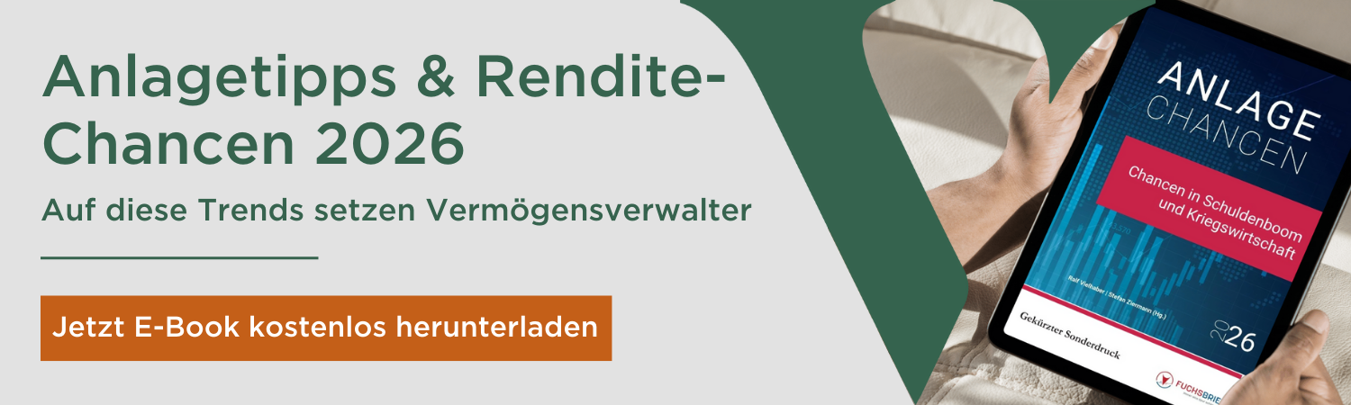 Im exklusiven Sonderdruck des Geldanlagebuches „Anlagechancen 2026“ des FUCHSBRIEFE Verlags erfahren Sie – u.a. in Gastbeiträgen von Vermögensverwaltern – die Antworten auf zentrale Fragen für das Anlagejahr 2026 und welche zahlreichen Opportunitäten sich daraus ergeben können.
